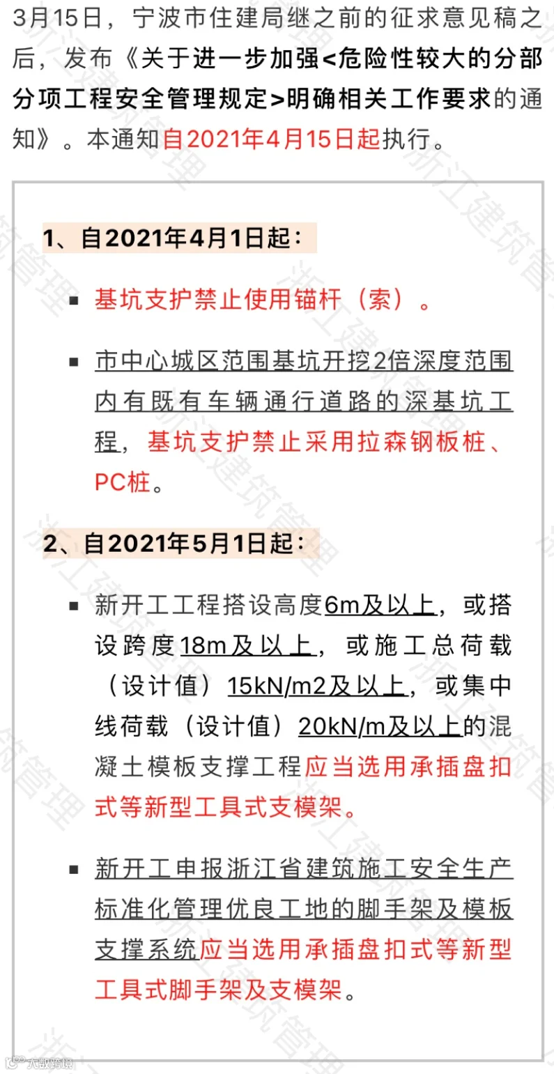 浙江宁波:自2021年4月1日起,基坑支护禁止使用锚杆(索),部分地区禁止采用拉森钢板桩、PC桩;自2021年5月1日起,新开工工程搭设一定规模的混凝土模板支撑工程应当选用承插盘扣式等新型工具式支模架。