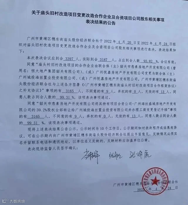 此次表决的主要目的,就是将恒大在庙头旧改所有股权装入“恒大+城投”联合控制的公司中。