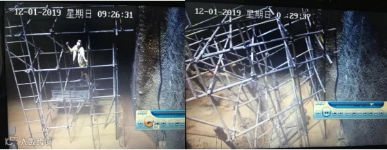 9时26分见一名工人寻找出口,9时29分起脚手架开始坍塌。