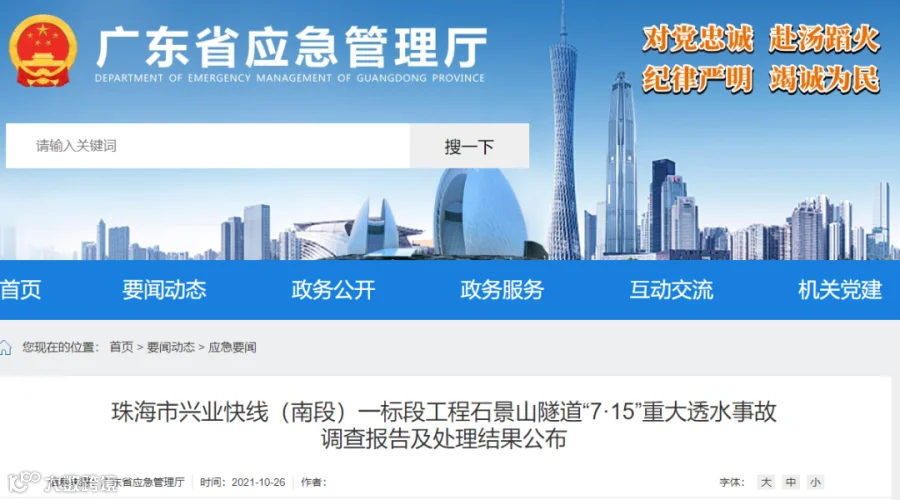 近日,省政府批复珠海市兴业快线(南段)一标段工程石景山隧道“7·15”重大透水事故调查报告,认定珠海市兴业快线(南段)一标段工程石景山隧道“7·15”透水事故是一起重大生产安全责任事故。