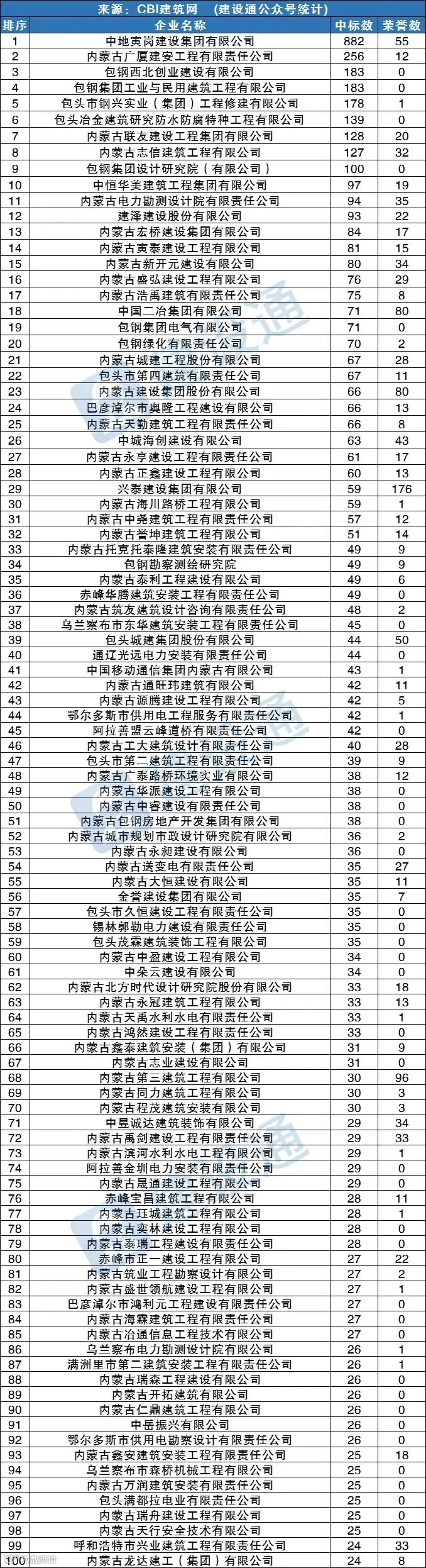 CBI建筑网综合报道:在2021年,内蒙古建筑施工企业中标数量达30546项,同比(与去年同期)上升4.66%。其中,中地寅岗建设集团有限公司、内蒙古广厦建安工程有限责任公司、包钢西北创业建设有限公司分列中标数量排行榜前三位。