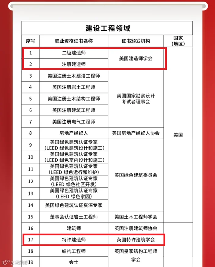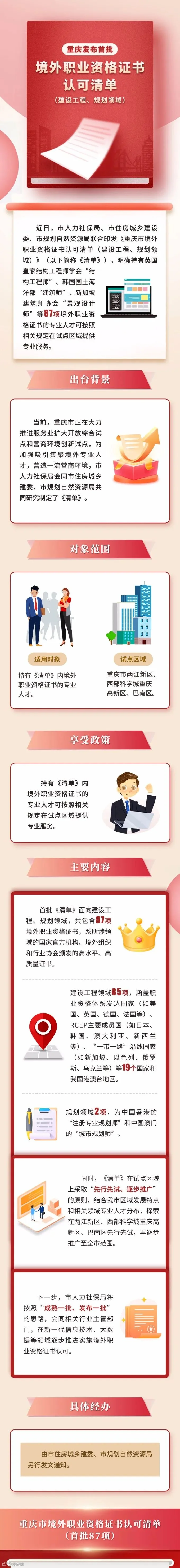近日,市人力社保局、市住房城乡建设委、市规划自然资源局联合印发《重庆市境外职业资格证书认可清单(建设工程、规划领域)》(以下简称《清单》),明确持有美国建造师协会建造师、英国建造师协会特许建造师、日本一二级建筑士、加拿大建造工程师、皇家结构工程师学会“结构工程师”、韩国国土海洋部“建筑师”、新加坡建筑师协会“景观设计师”等87项境外职业资格证书的专业人才可按照相关规定在试点区域提供专业服务。