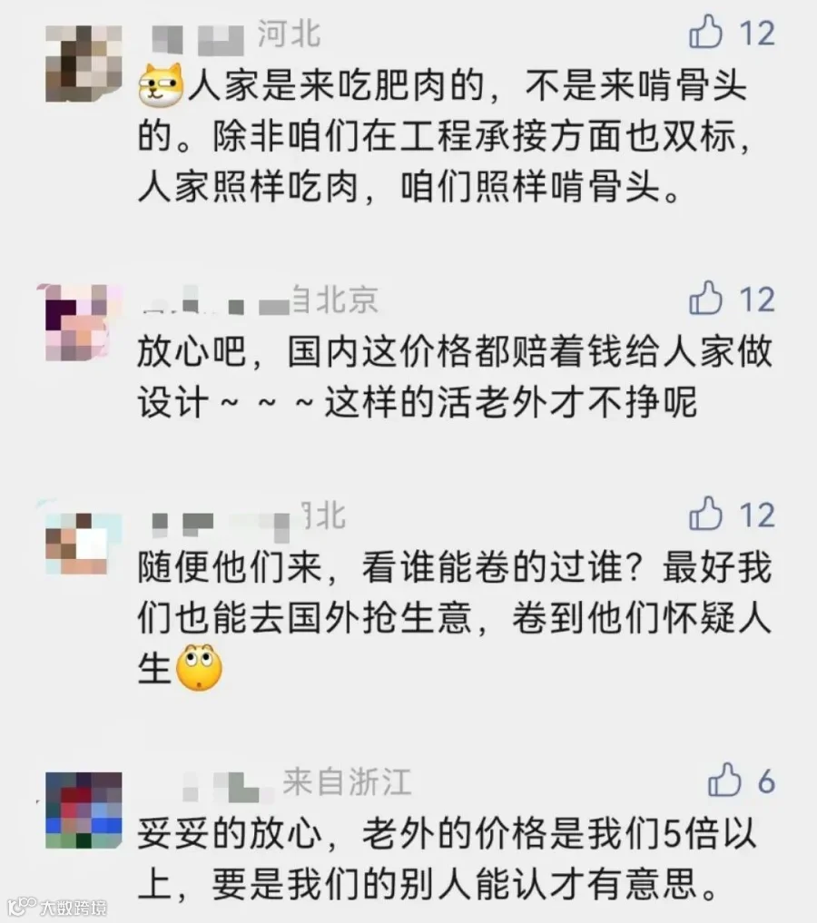 有人认为不用担心,老外们不可能接受国内工程设计行价,不会跟国内一起卷