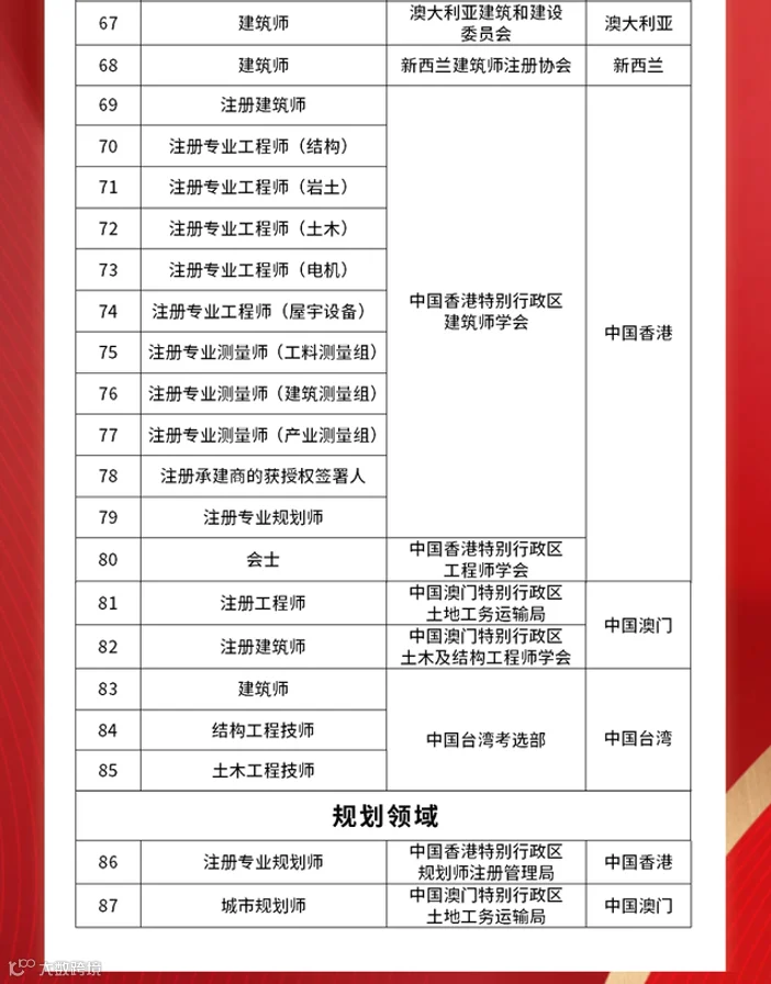首批《清单》面向建设工程、规划领域,共包含87项职业资格证书,系所涉领域的国家(地区)官方机构、行业组织颁发的高水平、高质量证书。其中规划领域2项,为中国香港“注册专业规划师”和中国澳门“城市规划师”;建设工程领域85项,涵盖职业资格体系发达国家(如美国、英国、德国、法国等)、RCEP主要成员国(如日本、韩国、澳大利亚、新西兰等)、“一带一路”沿线国家(如新加坡、以色列、俄罗斯、乌克兰等)等19个国家和我国港澳台地区。