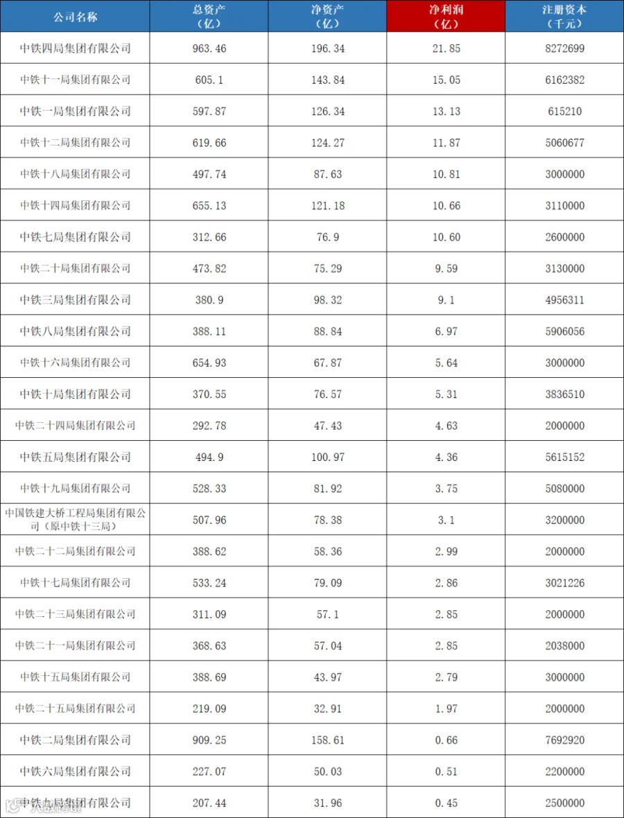 2020年净利润最高的为中铁四局18.3亿元。净利润超过10亿的有5家,分别为中铁四局、十一局、一局、十二局和七局,中铁九局净利润出现负数。