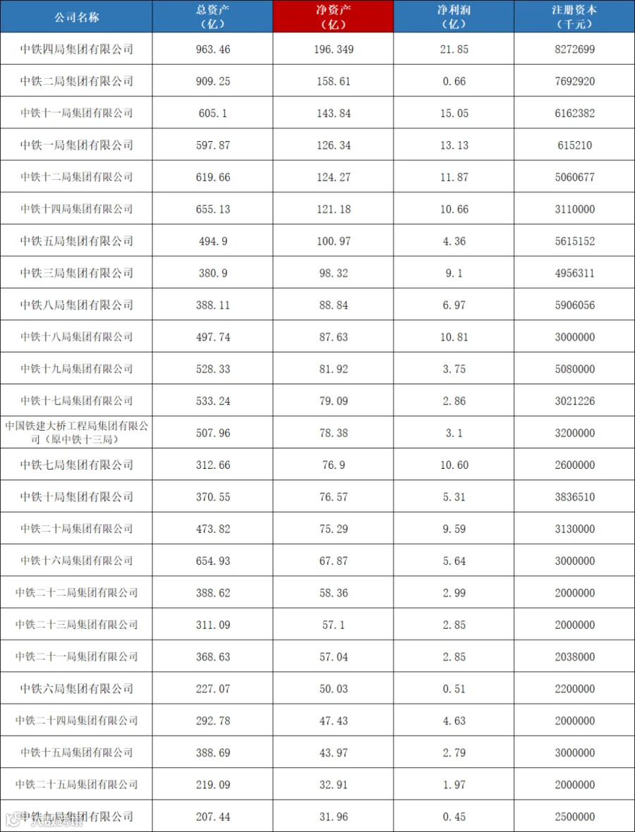 中铁1至25局净资产规模超过100亿有7家工程局,中铁四局净资产为196.34亿元排在第一位,中铁二局以净资产158.61亿元紧随其后。