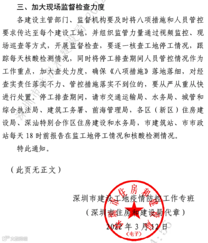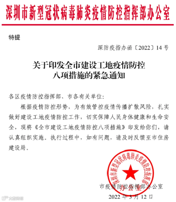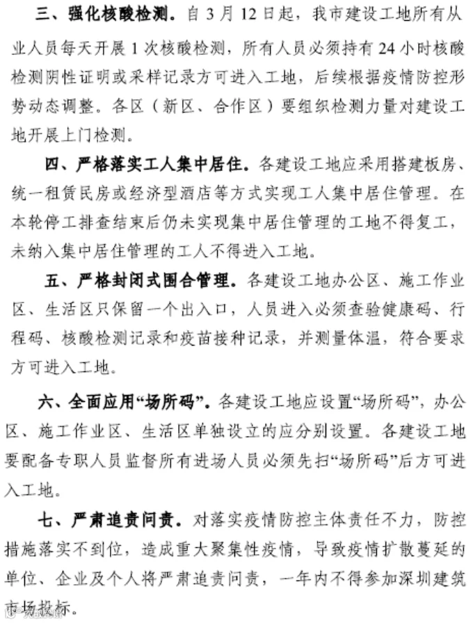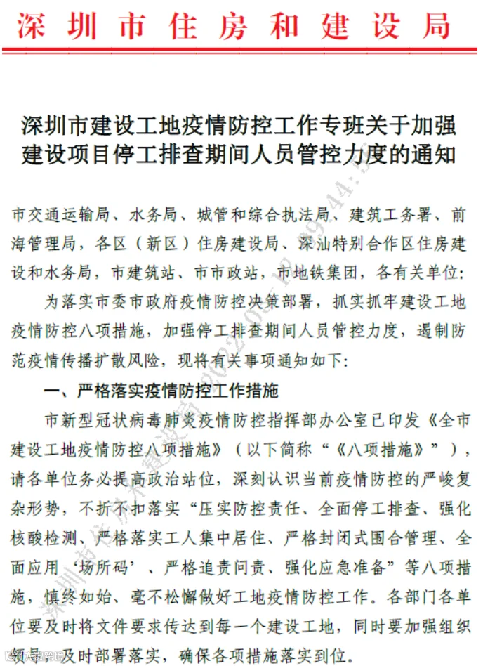 深圳7个工地被封控或有确诊比例轨迹涉及,住建局发文全市工地停工4天,防疫不力的,一年内不得参加深圳建筑市场投标;