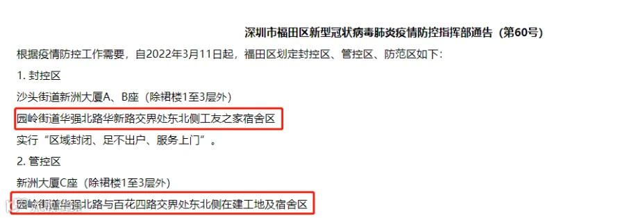 封控区:园岭街道华强北路华新路交界处东北侧工友之家宿舍区