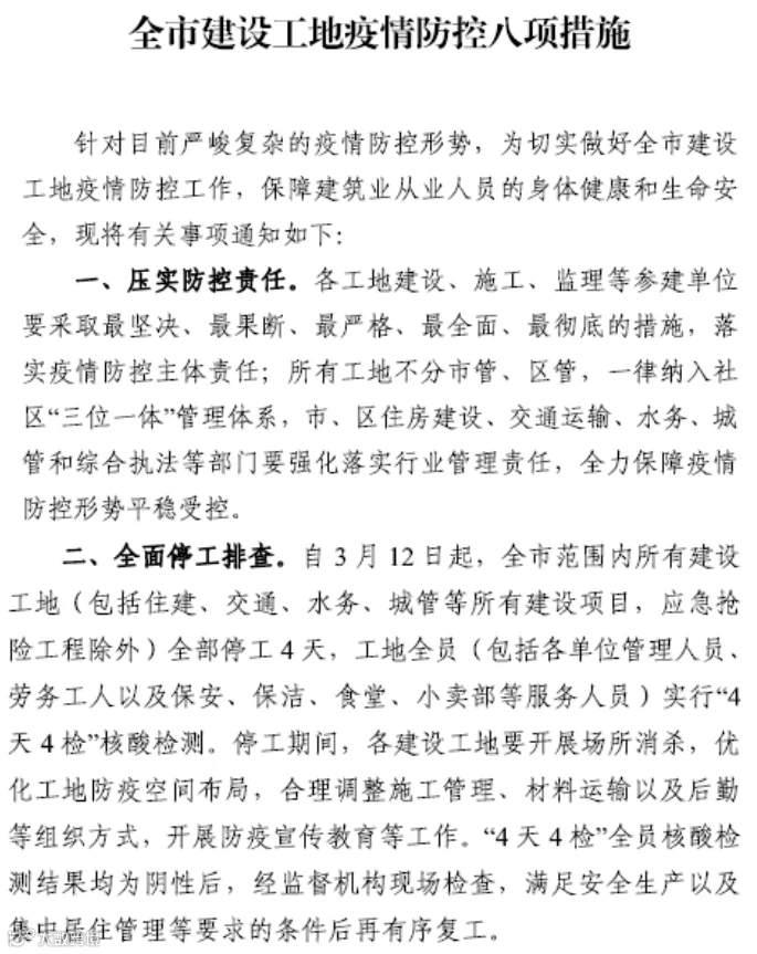 自3月12日起,全市范围内所有建设工地(包括住建、交通、水务、城管等所有建设项目,应急抢险工程除外)全部停工4天,工地全员(包括各单位管理人员、劳务工人以及保安、保洁、食堂、小卖部等服务人员)实行“4天4检”核酸检测。