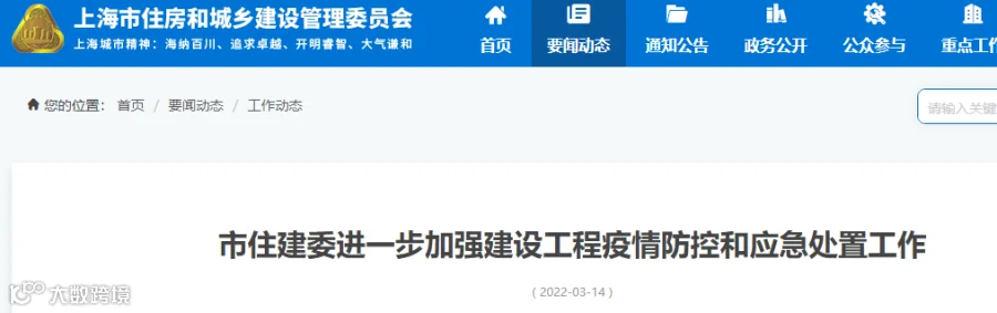 为深入贯彻落实3月11日市新冠肺炎疫情防控领导小组会议精神,结合当前本市新冠肺炎疫情防控形势,为有效阻断疫情传播,打好施工现场疫情“歼灭战”,从严从细从实做好本市建设工程疫情防控和应急处置工作,市住房城乡建设管理委发布《关于进一步加强本市建设工程疫情防控和应急处置工作的通知》。