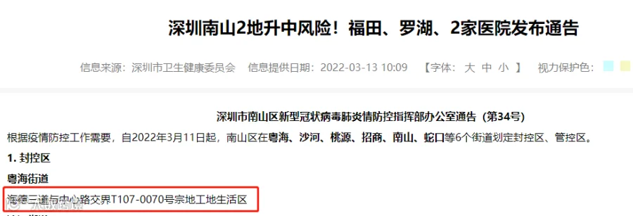 封控区:粤海街道的海德三道与中心路交界T107-0070号宗地工地生活区