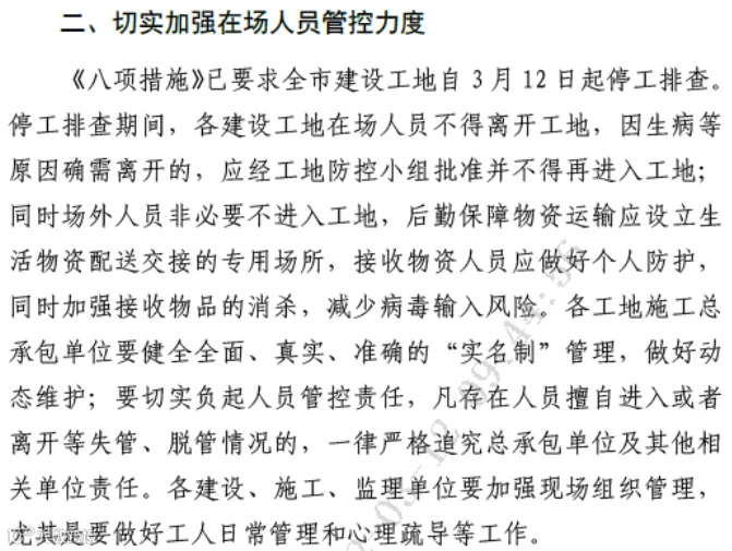 (一)即日起本市所有建设工程实施“封闭式”管理。各工地应制定疫情防控应急预案,按照人员只进不出的原则进行管理,不具备封闭施工条件的装饰装修工程、加装电梯工程、房屋修缮工程等暂停施工(特殊情况需要继续施工的必须通过行业主管部门批准),暂缓新项目开工,后续开复工视疫情管控情况另行通知。各相关单位根据疫情防控要求做好停工项目人员管理。