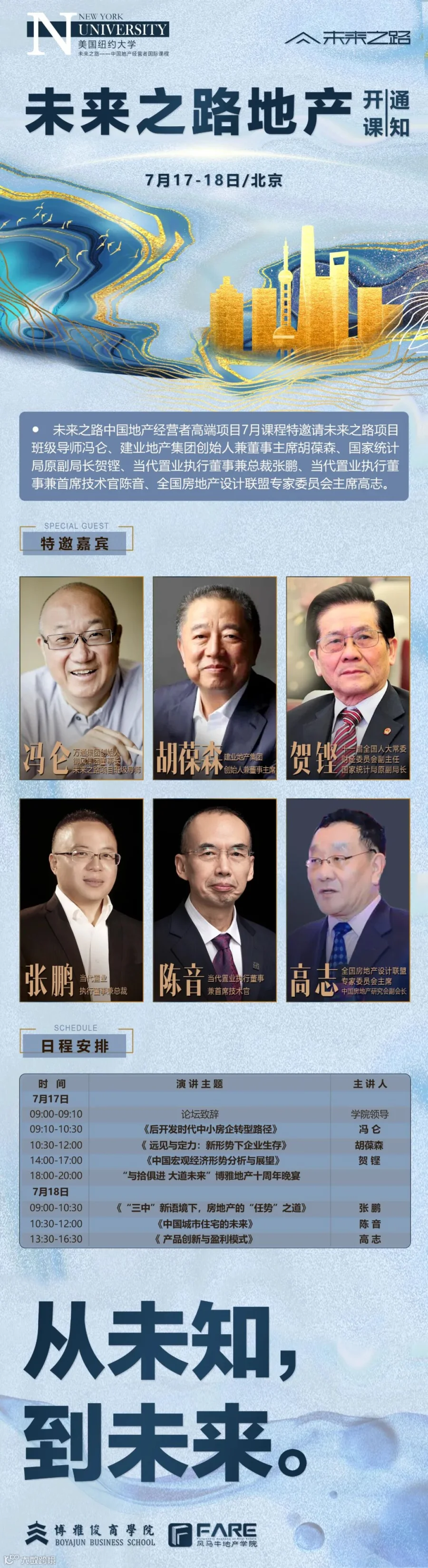 ✦ 博雅俊商学院地产学院与纽约大学沙克地产学院、风马牛地产学院联袂推出的“未来之路—中国地产经营者”国际课程,力邀中美两国最具代表性的地产代表人物、践行者和经济学者,与更多地产经营者一起回顾中美两国地产的发展脉络,共同探寻中国地产发展的未来之路。