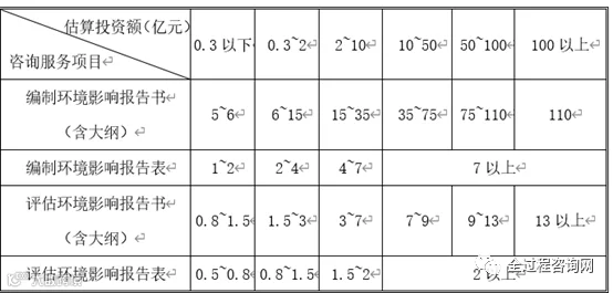环境影响评估报告编制费基价根据估算投资额在相对应的区间内用插入法计算,如下表所示(单位:万元)。