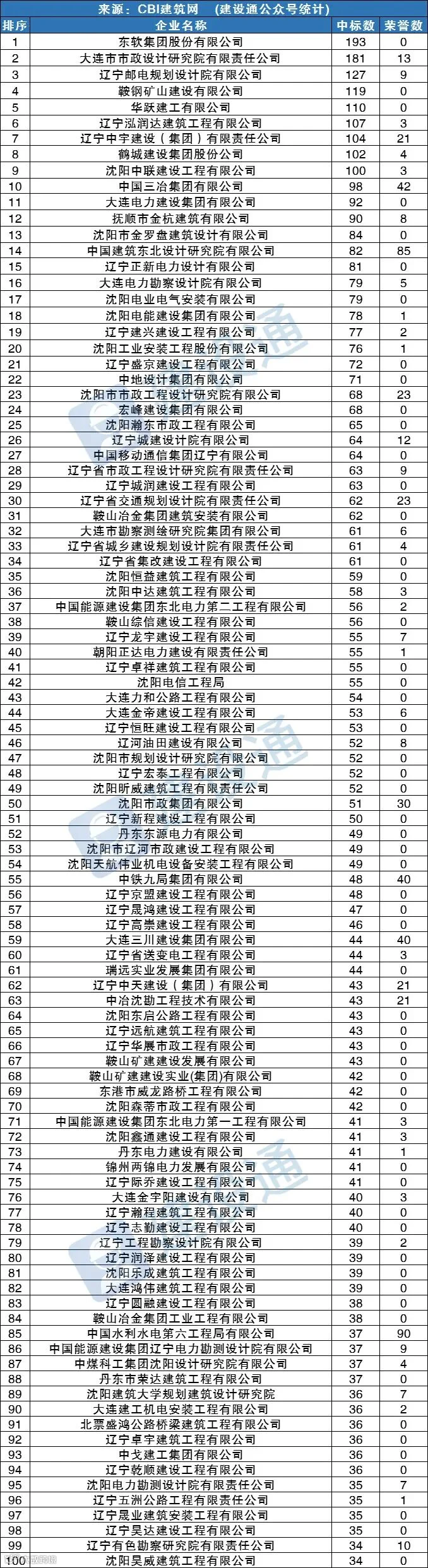 CBI建筑网综合报道:在2021年,辽宁建筑施工企业中标数量达30766项,同比(与去年同期)下降1.24%。其中,东软集团股份有限公司、大大连市市政设计研究院有限责任公司、辽宁邮电规划设计院有限公司分列中标数量排行榜前三位。