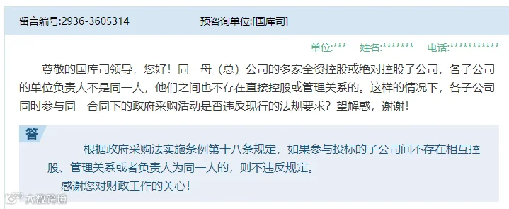 四、同一母(总)公司的多家全资控股或绝对控股子公司,各子公司的单位负责人不是同一人,他们之间也不存在直接控股或管理关系的。这样的情况下,各子公司同时参与同一合同下的政府采购活动是否违反现行的法规要求?