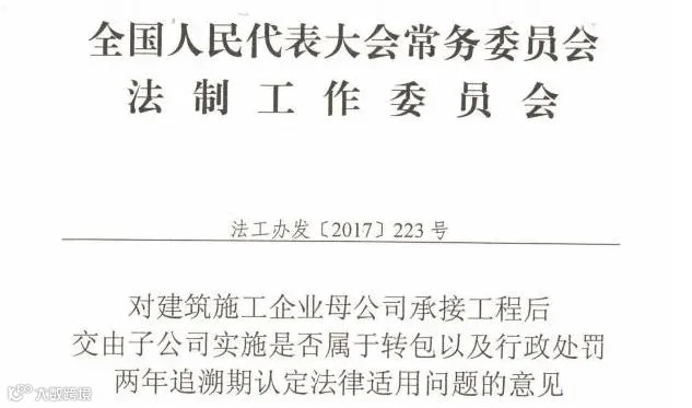 2017年,住建部曾向全国人大法工委发出请示函,全国人大法工委作出《对建筑施工企业母公司承接工程后交由子公司实施是否属于转包以及行政处罚两年追溯期认定法律适用问题的意见》(法工办发[2017]223号,以下简称《意见》)认为: