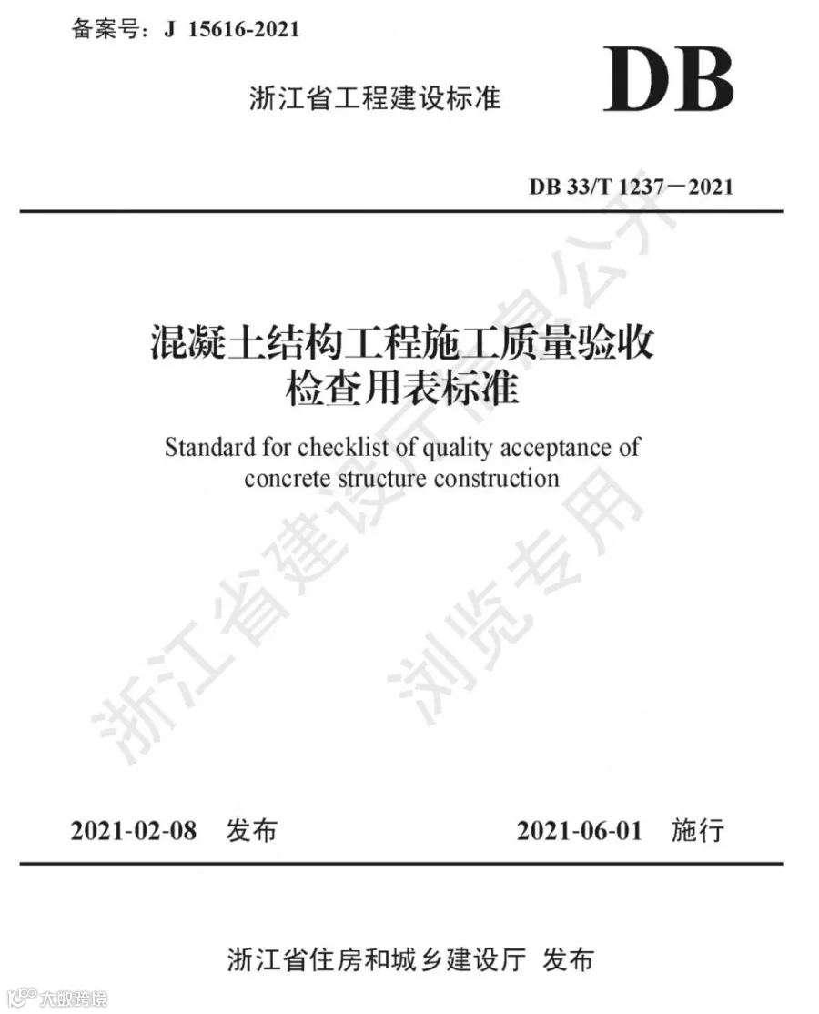 现批准《混凝土结构工程施工质量验收检查用表标准》为浙江省工程建设标准,编号为DB33/T1237-2021,自2021年6月1日起施行。