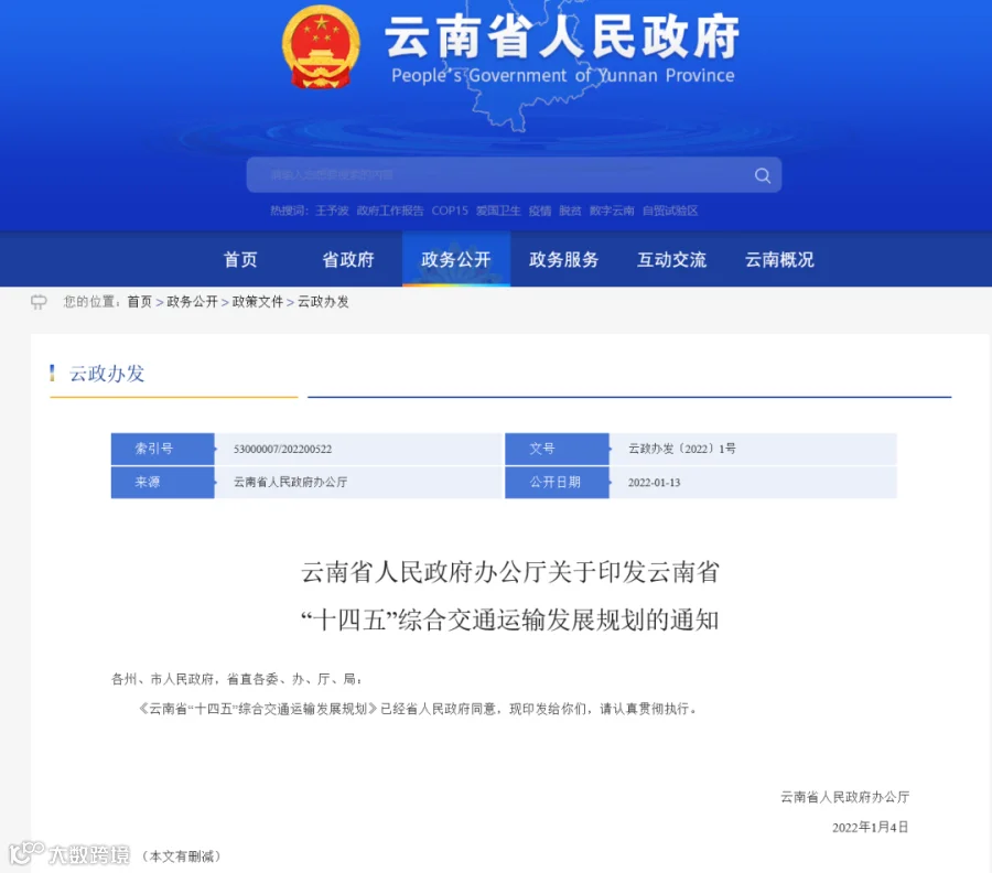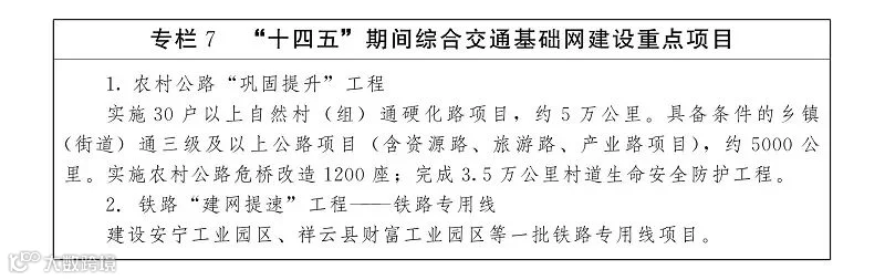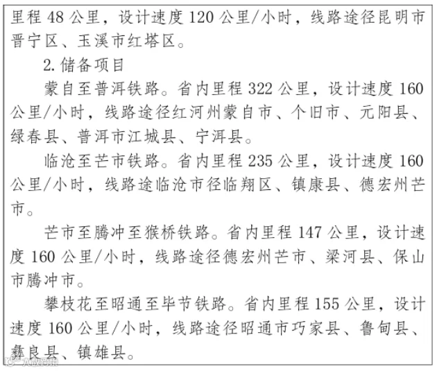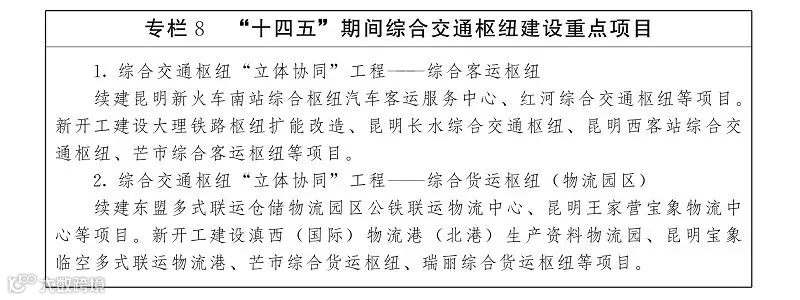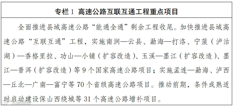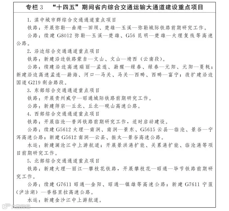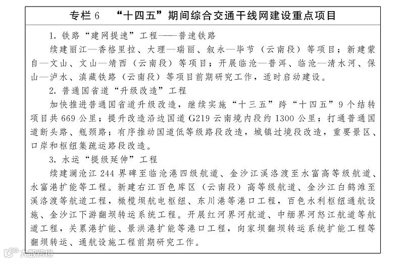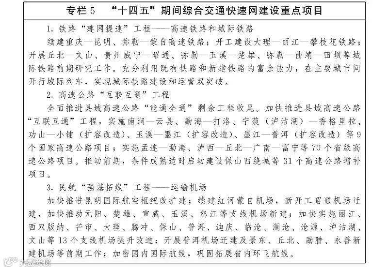 另据云南省交通运输厅印发的《云南省公路“十四五”发展规划》、《云南省铁路“十四五”发展规划》,“十四五”期间安排的重点项目有:
