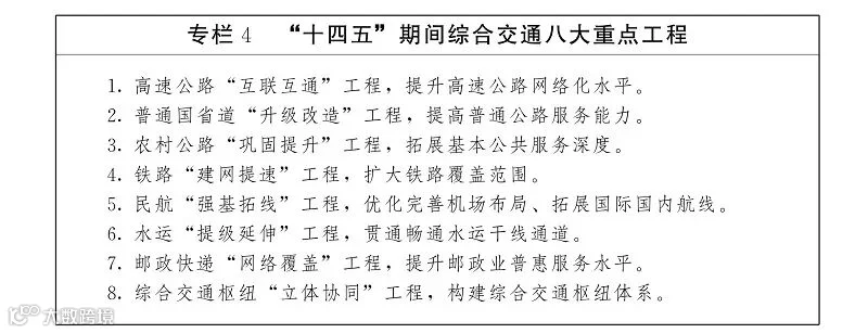 推动公路网、铁路网、航空网、水运网、邮政网深度融合,构建综合交通基础设施“3张网”,进一步完善综合交通经济走廊骨架网,实施综合交通八大重点工程。