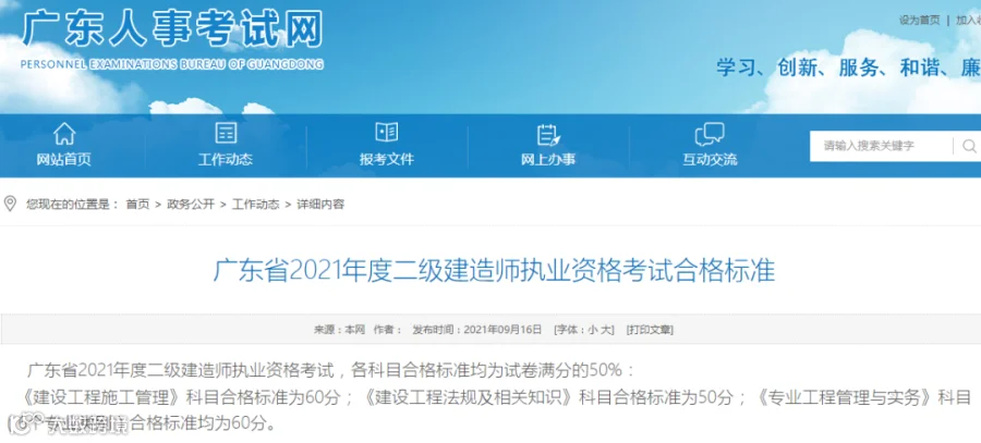 根据《人力资源社会保障部办公厅关于印发<专业技术人员职业资格考试考务工作规程>的通知》(人社厅发〔2021〕18号)和广东省人力资源和社会保障厅办公室《关于印发实行告知承诺制证明事项清单的通知》(粤人社办〔2021〕8号)及专业技术人员职业资格考试报名证明事项告知承诺制相关要求,现对广东省2021年度二级建造师执业资格考试成绩合格人员予以公示,共66597人(详见附件1)。