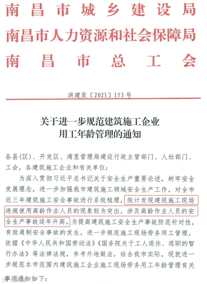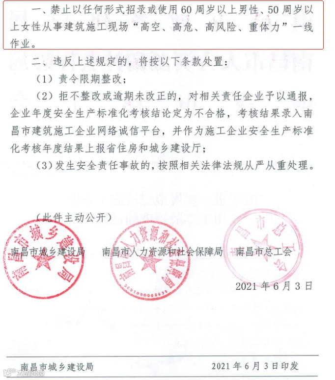 6月11日,南昌市城乡建设局发布了关于进一步规范建筑施工企业用工年龄管理的通知,通知明确: