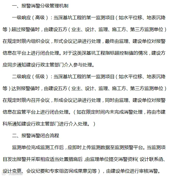 (五)已接入监测平台管理的监测数据可作为施工安全监管的依据。各质量安全监督机构应本辖区深基坑工程加强日常管理,督促监测单位及时上传监测数据,跟踪监测预警的闭合处理。