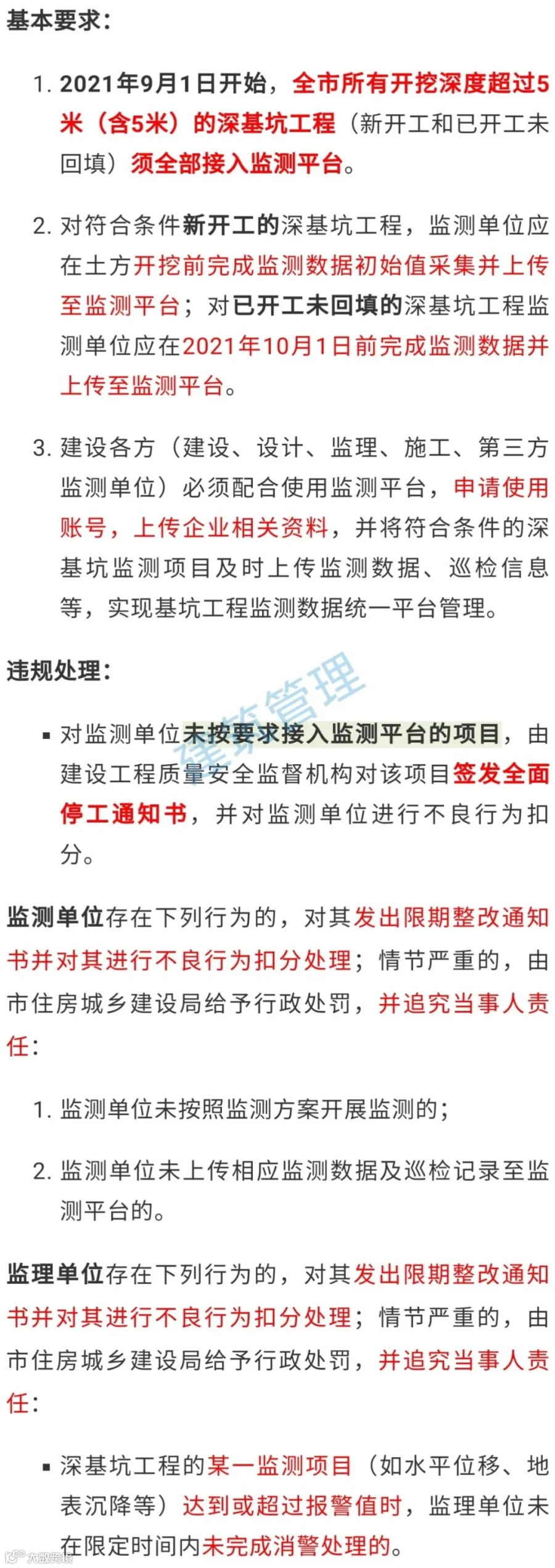 (一)2021年9月1日开始,全市所有开挖深度超过5米(含5米)的深基坑工程(新开工和已开工未回填)须全部接入监测平台。