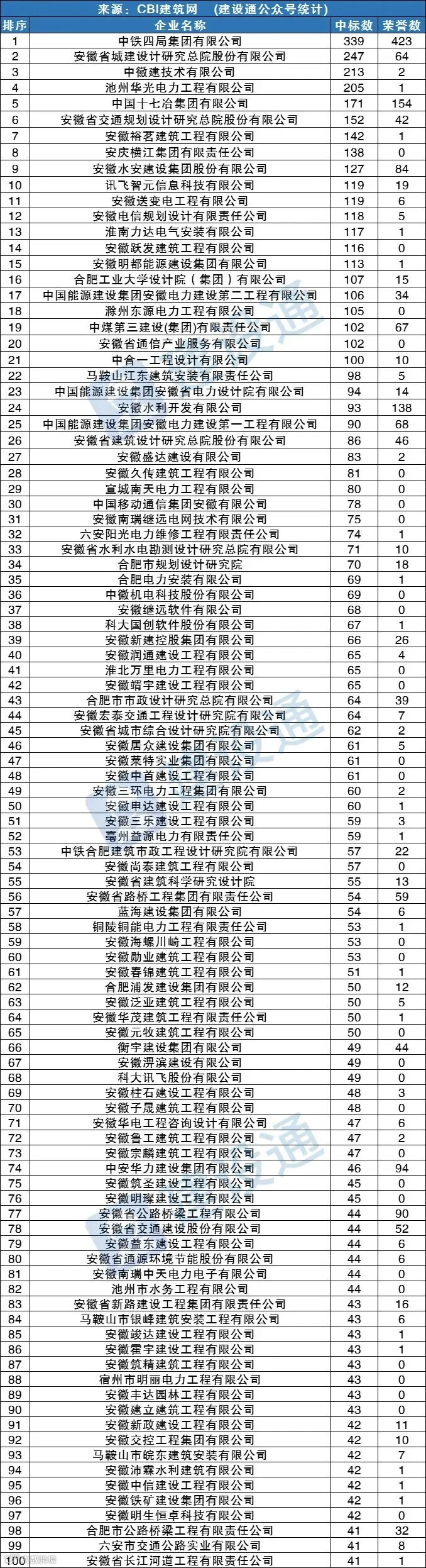 CBI建筑网综合报道:在2021年,安徽建筑施工企业中标数量达69706项,同比(与去年同期)上升1.20%。其中,中铁四局集团有限公司、安徽省城建设计研究总院股份有限公司、中徽建技术有限公司分列中标数量排行榜前三位。