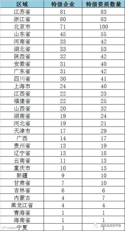 按特级资质企业注册地统计,江苏、浙江、北京、山东、河南和湖北分别以81家、80家、71家、45家、33家(河南和湖北并列)位列前五,西藏成为全国唯一没有特级资质企业的省份,宁夏、青海、海南分别有1家特级资质。