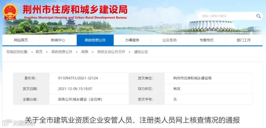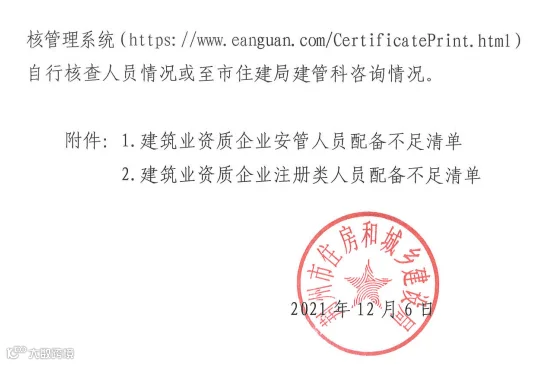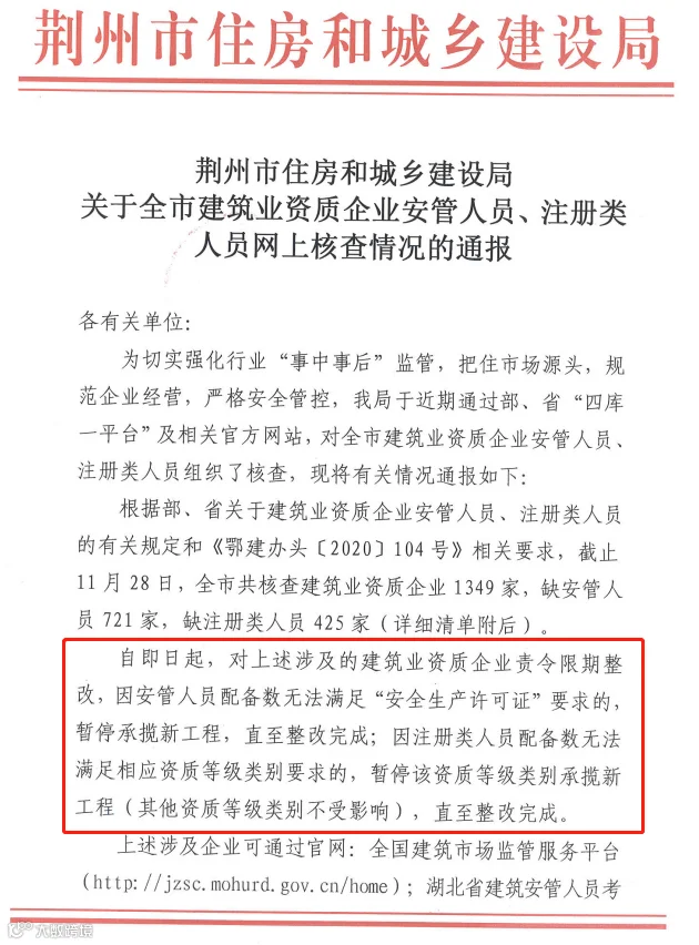 12月6日,荆州市住建局发布《关于全市建筑业资质企业安管人员、注册类人员网上核查情况的通报》。共通报1146家建企,其中:缺安管人员721家,缺注册类人员425家。