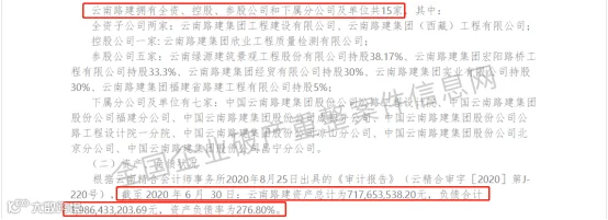 根据云南精合会计师事务所2020年8月25日出具的《审计报告》(云精合审字[2020]第J-220号),截至 2020 年 6 月 30 日:云南路建资产总计为717,653,538.20元,负债合计1,986,433,203.69元,资产负债率为276.80%。