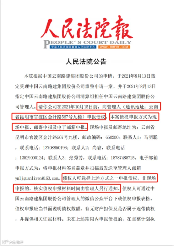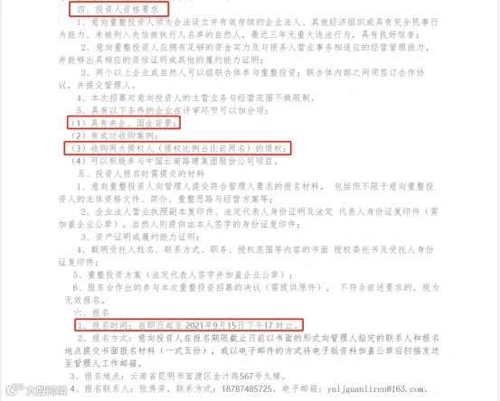 尽管云南路建集团8月13日才被裁定受理破产重整,但招募重整投资人节奏快,行动迅速,报名仅截至9月15日。