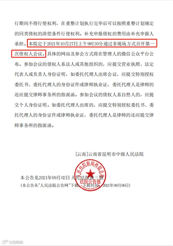 案件目前已进入债权申报程序,云南省昆明市中级人民法院公告显示,债权公司需在2021年10月15日前,向管理人申报债权。10月27日上午,将通过非现场方式召开第一次债权人会议。