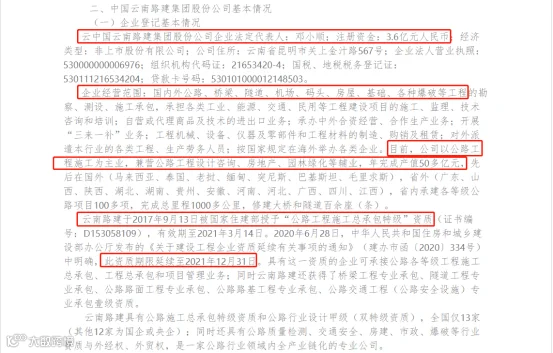 据了解,云南路建于2017年9月13日获得“公路工程施工总承包特级”资质,同时还拥有桥梁工程专业承包、隧道工程专业承包、公路路面工程专业承包、公路路基工程专业承包、公路交通工程(公路安全设施)专业承包壹级资质。