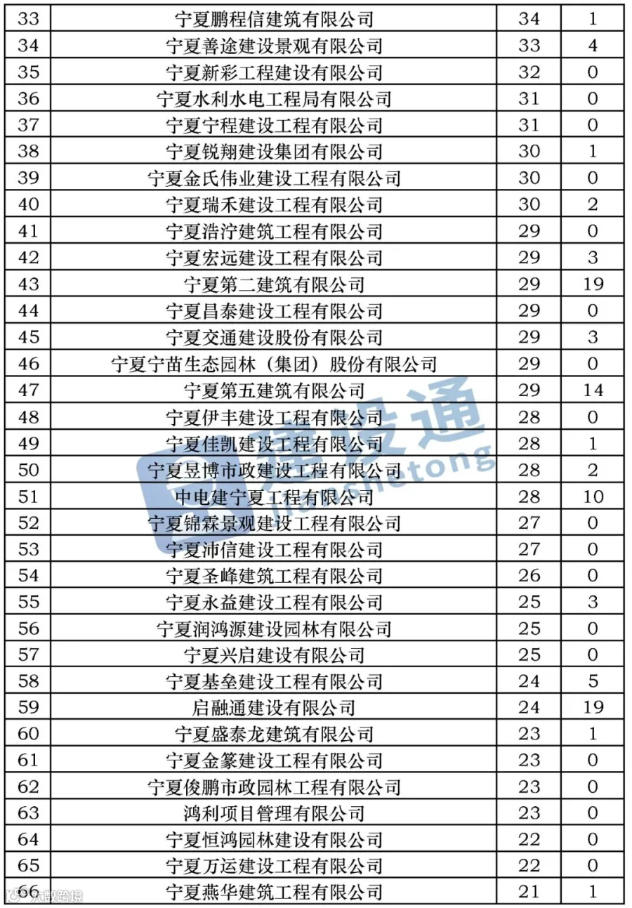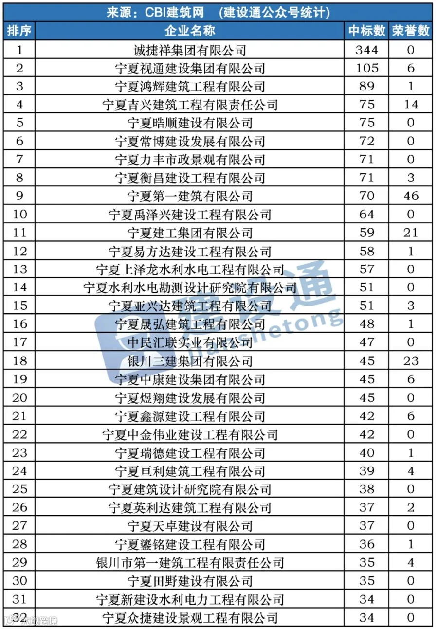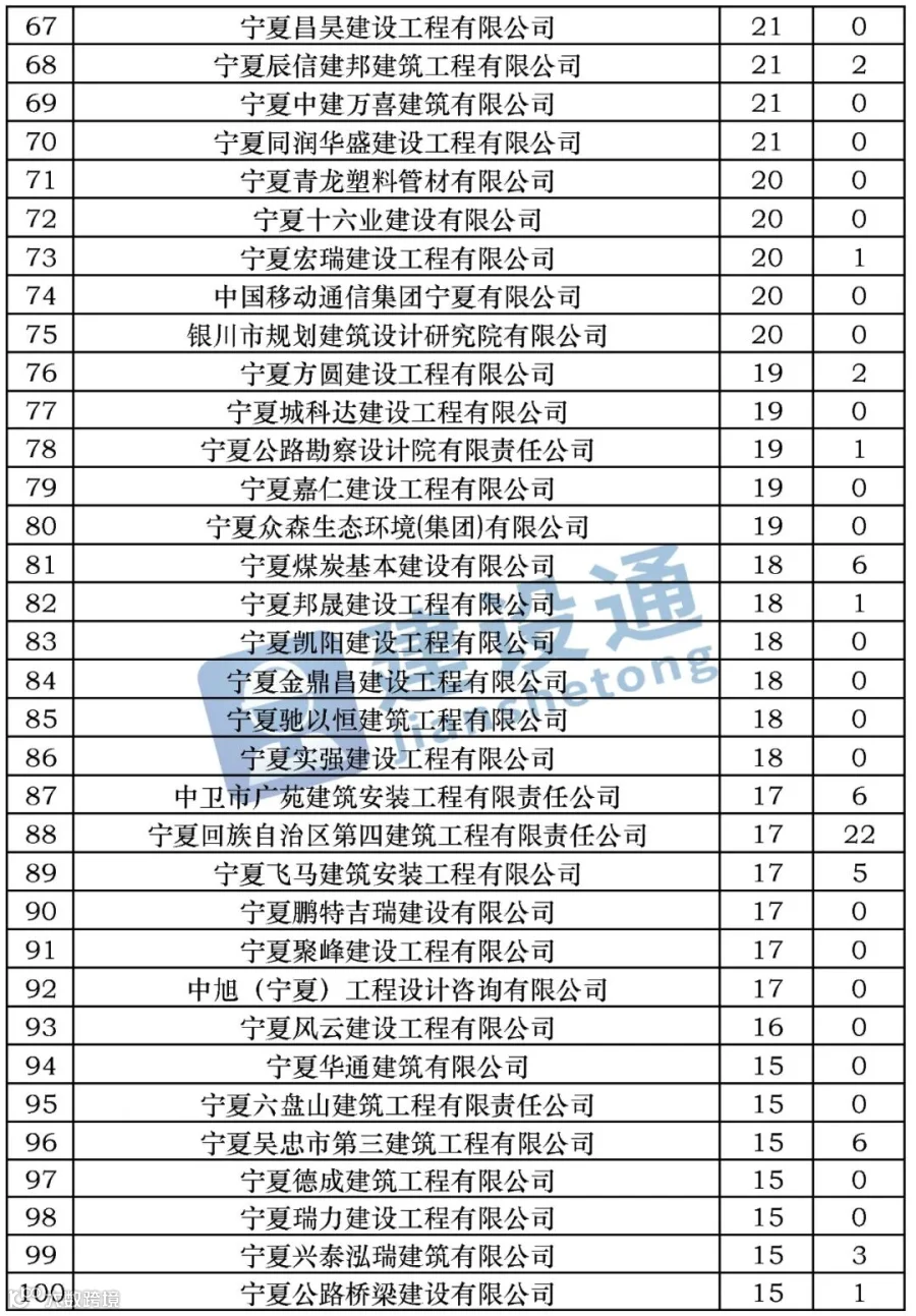 CBI建筑网综合报道:在2020年,宁夏建筑施工企业中标数量达6791项,同比(与去年同期)上升12.19%。其中,诚捷祥集团有限公司、宁夏视通建设集团有限公司、宁夏鸿辉建筑工程有限公司分列中标数量排行榜前三位。