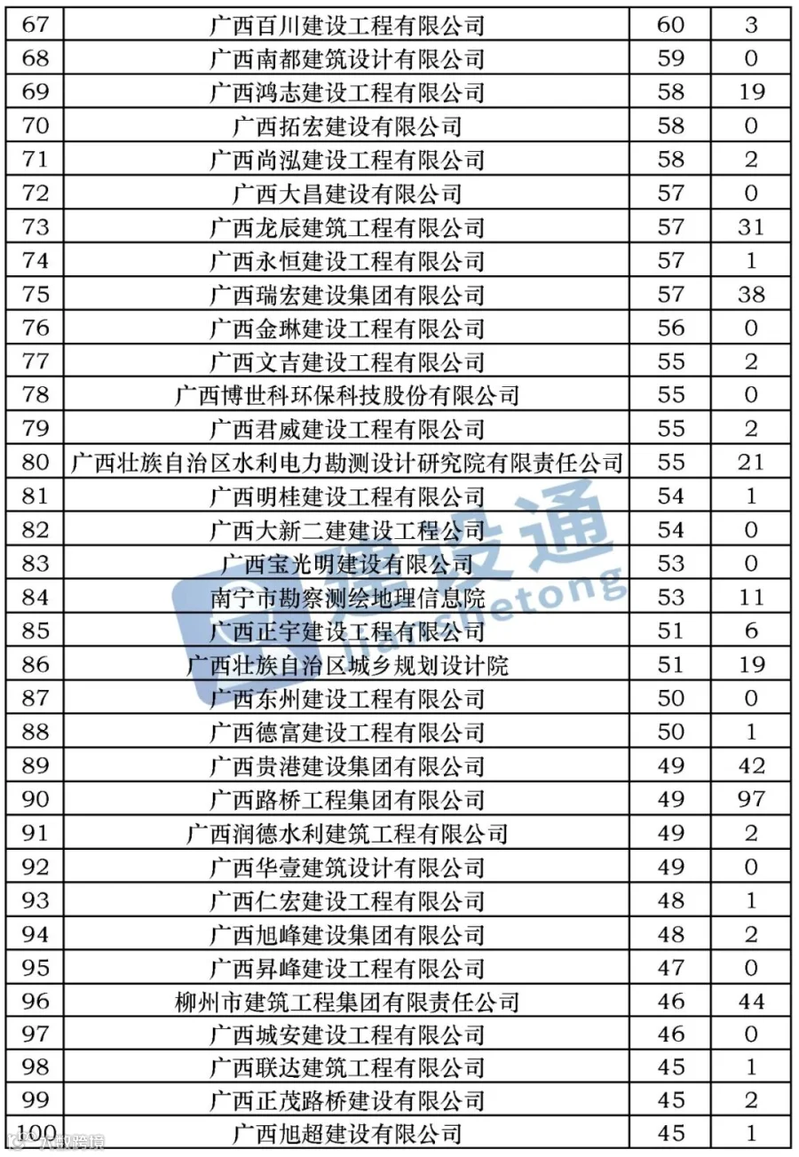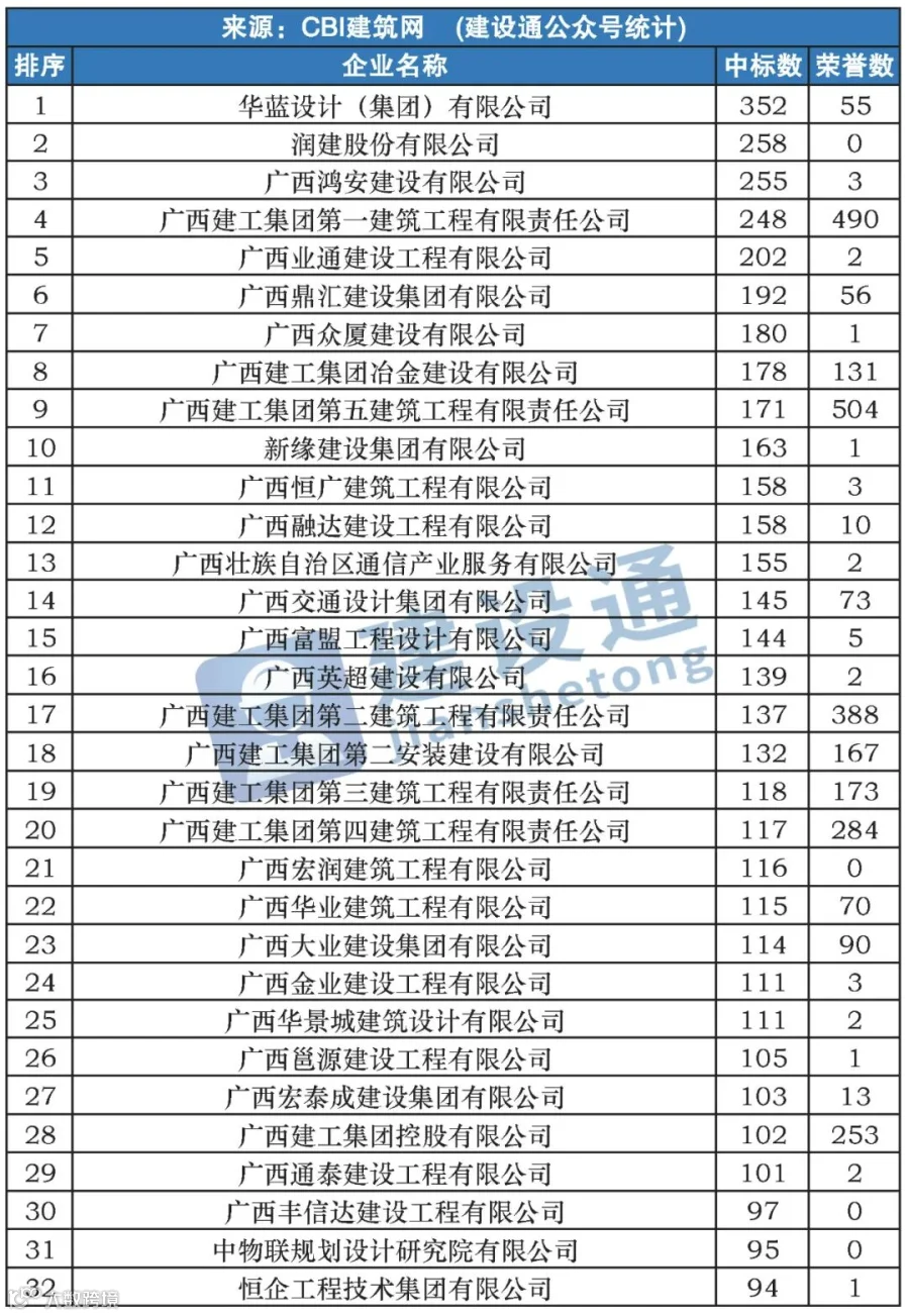 CBI建筑网综合报道:在2020年,广西建筑施工企业中标数量达30316项,同比(与去年同期)下降6.28%。其中,华蓝设计(集团)有限公司、润建股份有限公司、广西鸿安建设有限公司分列中标数量排行榜前三位。