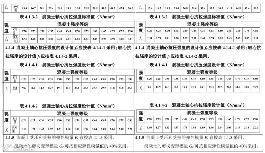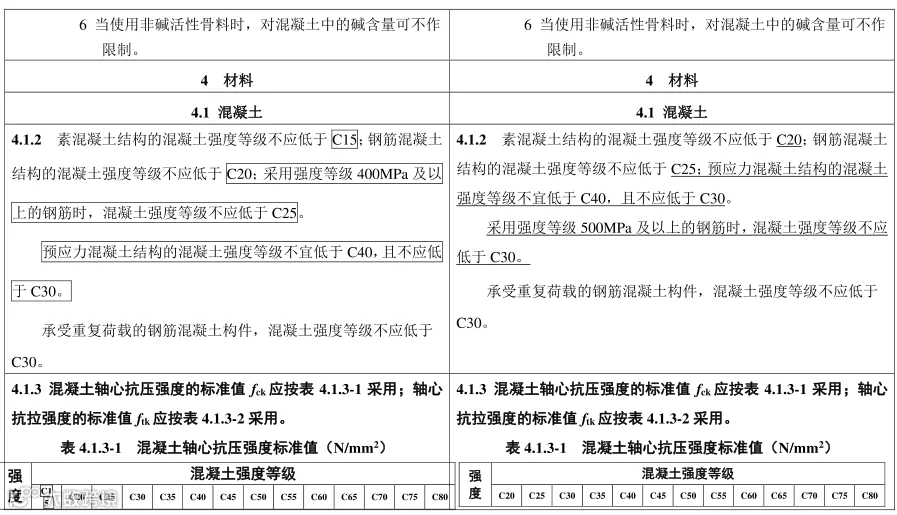 2 提高混凝土强度应用的最低等级要求。4.1.2条素混凝土结构的混凝土强度等级由“不应低于C15”改为“不应低于C20”,钢筋混凝土结构的混凝土强度等级由“不应低于C20”改为“不应低于C25”。删除4.1.3条、4.1.4条中C15混凝土的强度指标。
