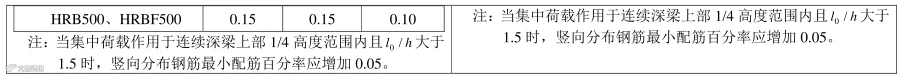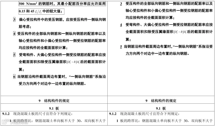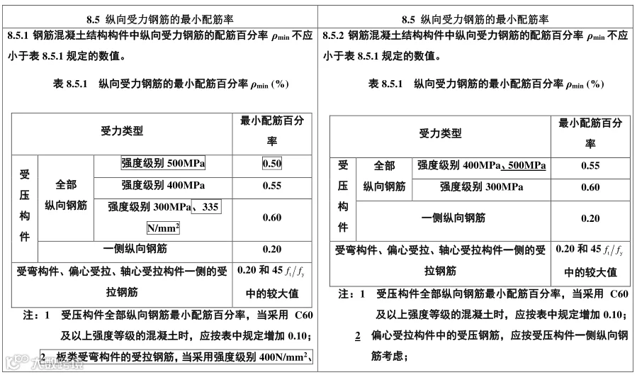 4 8.5.1条最小配筋率要求中,将受压构件中500MPa钢筋最小配筋0.50%提高为与400MPa钢筋相同的0.55%,删除表注2中“板类受弯构件受拉钢筋,当采用400MPa、500MPa钢筋时,最小配筋率允许采用0.15和45ft/fy中的较大值”的规定。