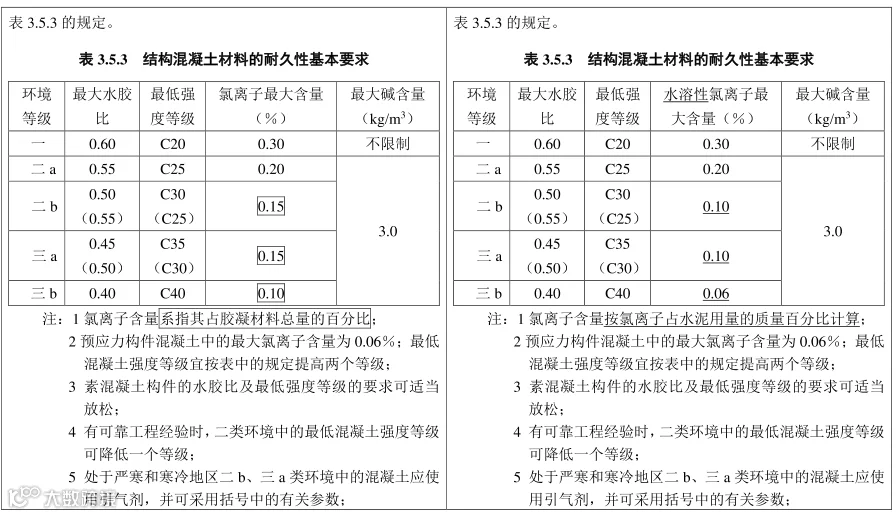 1 表3.5.3的结构混凝土材料耐久性基本要求将氯离子含量由“占胶凝材料总量百分比”改为“占水泥用量的质量百分比”,二b、三a、三b环境的氯离子最大含量数值要求分别从0.15%、0.15%、0.10%加严为0.10%、0.10%、0.06%。