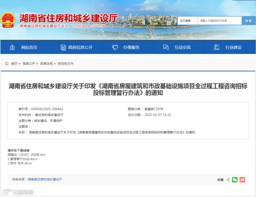 近日,湖南省住建厅发布《湖南省房屋建筑和市政基础设施项目全过程工程咨询招标投标管理暂行办法》,规范全过程工程咨询招标投标活动。