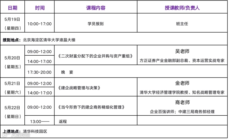 ”所谓大学者,非谓有大楼之谓也,有大师之谓也。”《清大高级工商管理(建筑业)总裁研修班》课 程将于 2022 年 5 月 20 -22 日在北京清华科技园开课。课程安排如下,为保证您准时参课,请提前安排 好往返行程。