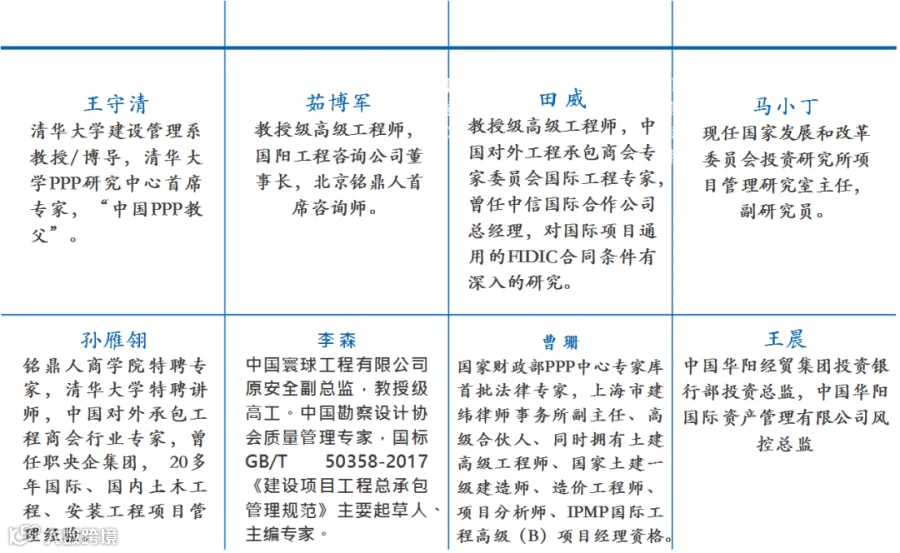 专家团队由财政部、财政学会PPP专业委员、住建部、交通部等政府领导;国家开发银行、中信(香港)投资公司、摩根盛通等投资机构高管;清华大学建筑学院、中国国际咨询公司等研究机构专家学者构成。