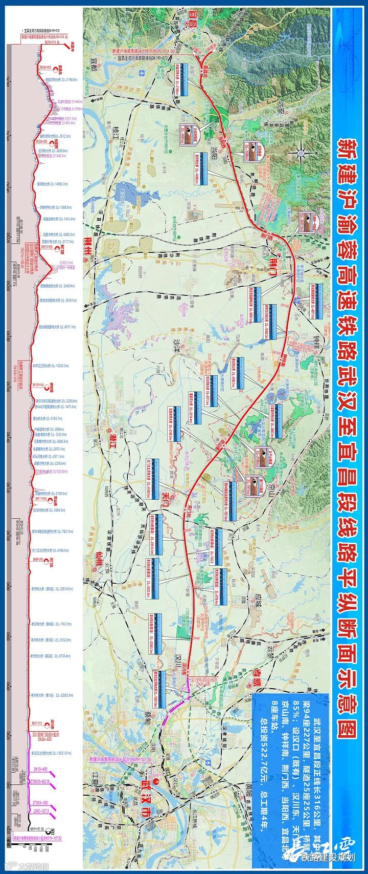 项目起自武汉市,经天门市、荆门市,终至宜昌市,正线全长313公里,设汉口(既有)、汉川东、天门北、京山南、钟祥南、荆门西、当阳西、宜昌北8座车站,桥隧占比85%,设计时速350公里,项目总投资522.7亿元,建设总工期4年。