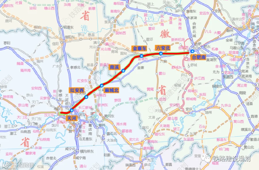 根据长江沿岸铁路集团8月26日发布的第一次环评公示,本项目推荐线路起自既有合肥南站,利用既有沪蓉铁路至K501+900接轨引出,向西经六安、黄冈,西至武汉市,于东西湖区芦港线路所衔接沪渝蓉高铁武宜段。涉及安徽省合肥市、六安市、湖北省黄冈市、武汉市四个地级市。总投资达872.3亿元。