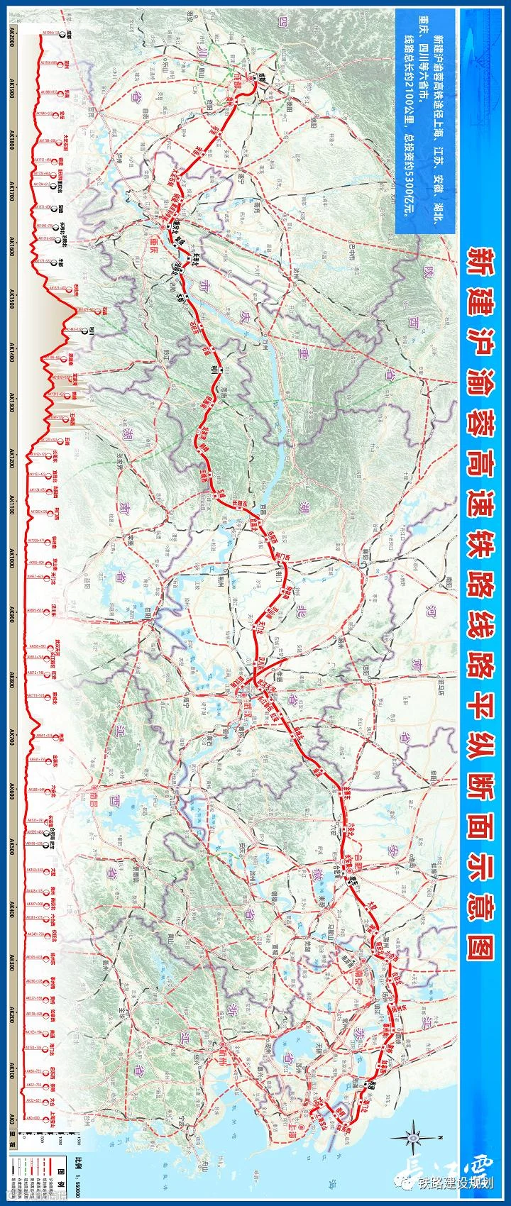 沿江高铁,又称沪渝蓉高铁,途径上海、江苏、安徽、湖北、重庆、四川等六省市,线路总长约1955公里,总投资约5300亿元,全线设计时速350公里。是我国“八纵八横”高速铁路客运通道中的重要“一横”。