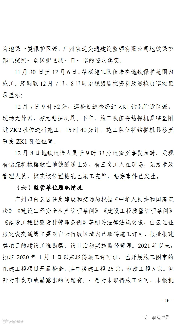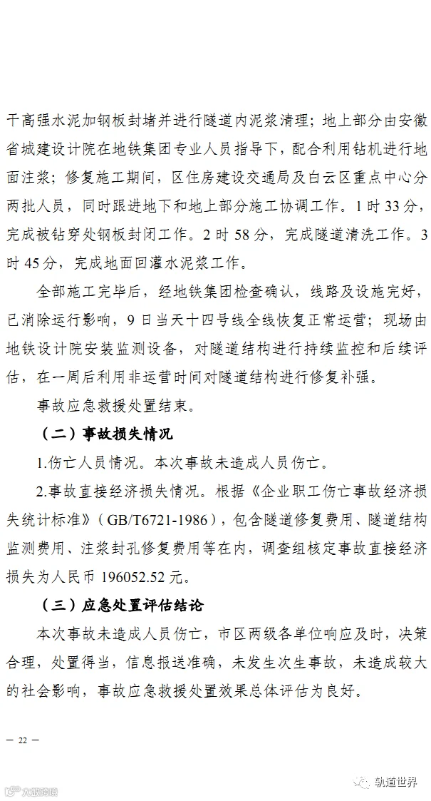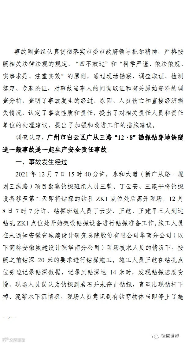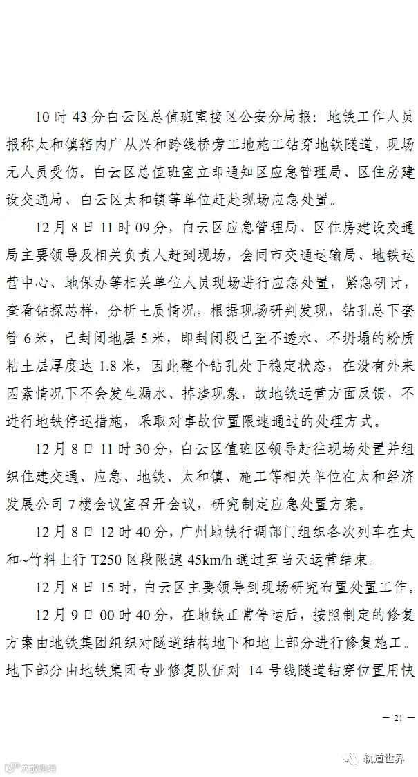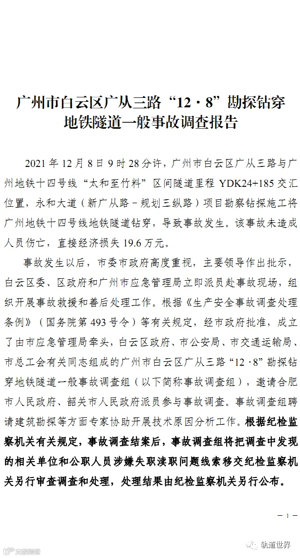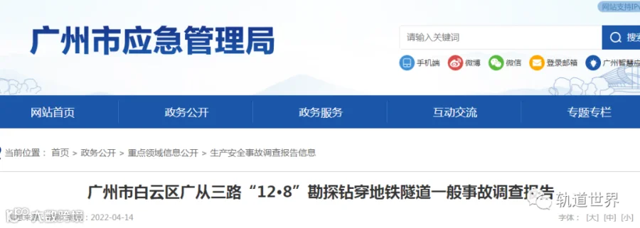 4月14日,广州市应急管理局官方网站发布《广州市白云区广从三路“12·8”勘探钻穿地铁隧道一般事故调查报告》。