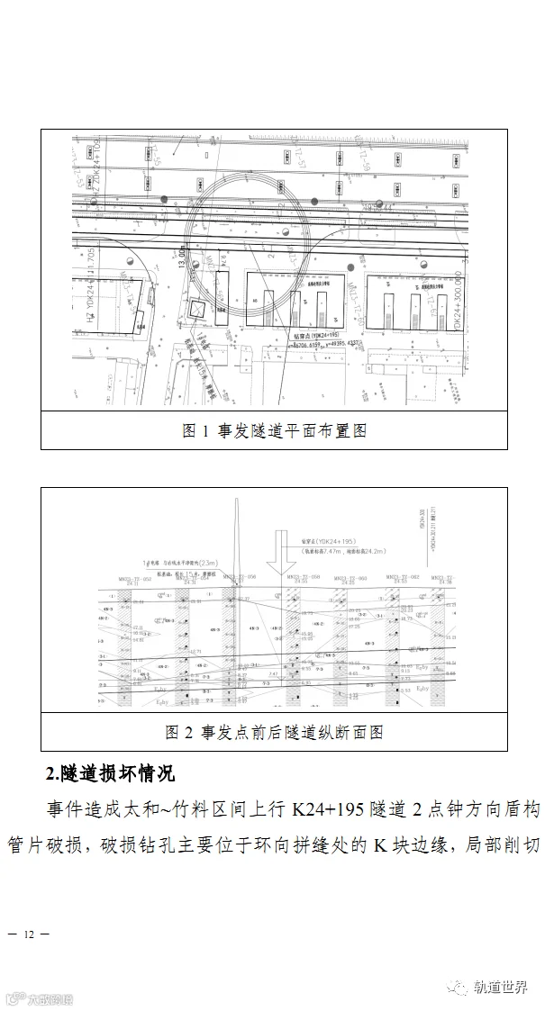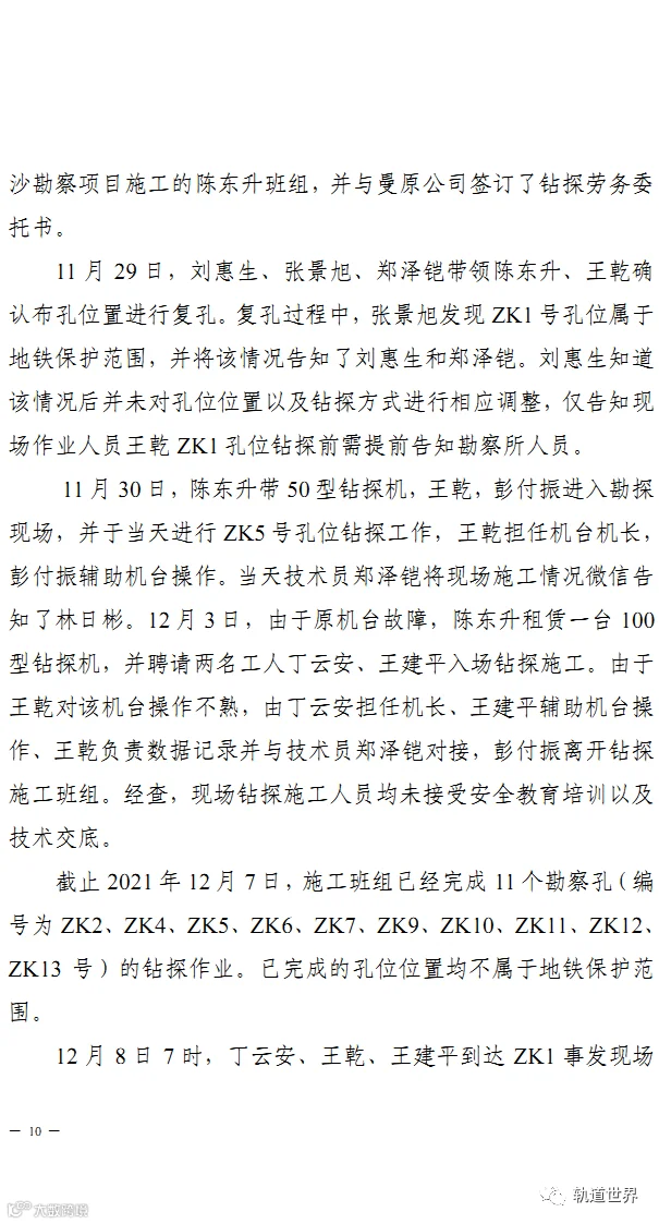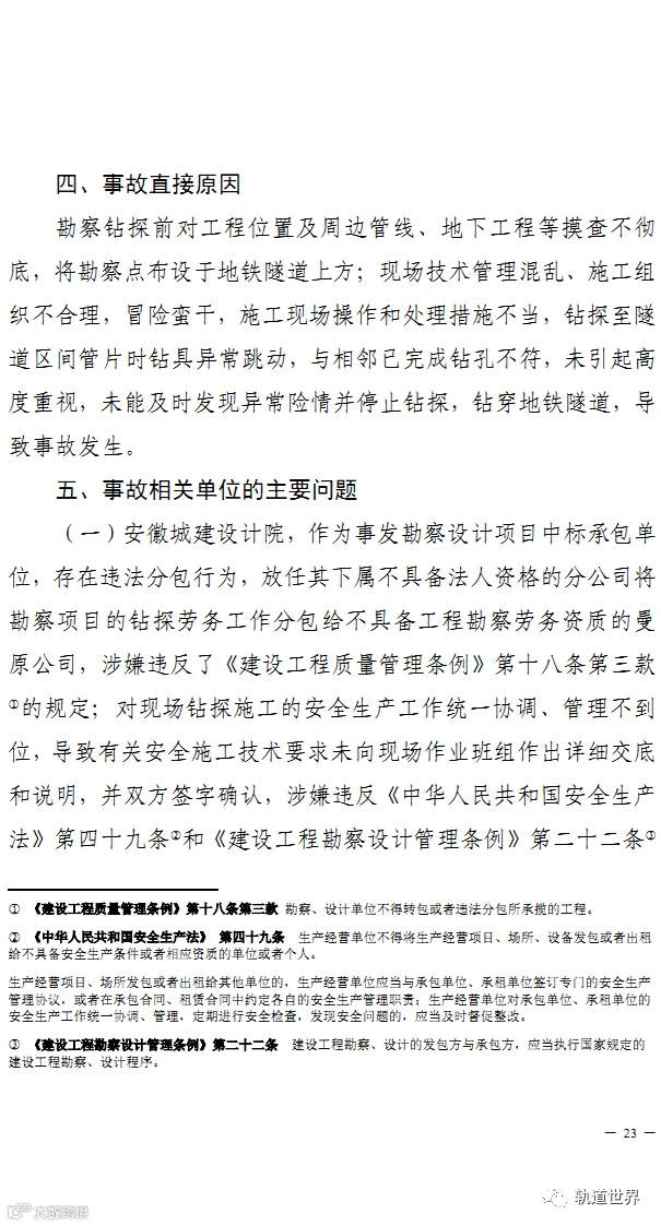 调查报告称,事故直接原因是,勘察钻探前对工程位置及周边管线、地下工程等摸查不彻底,将勘察点布设于地铁隧道上方;现场技术管理混乱、施工组织不合理,冒险蛮干,施工现场操作和处理措施不当,钻探至隧道区间管片时钻具异常跳动,与相邻已完成钻孔不符,未引起高度重视,未能及时发现异常险情并停止钻探,钻穿地铁隧道,导致事故发生。