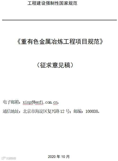 《重有色金属冶炼工程项目规范(征求意见稿)》
