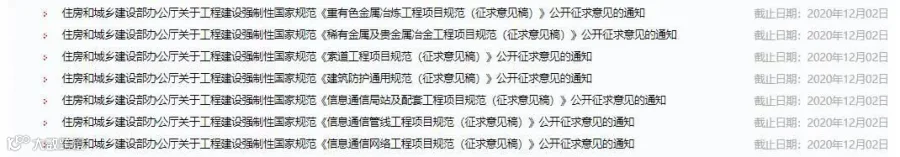 住建部近日发布七项工程建设强制性国家规范的公开征求意见稿,意见征求截止日期皆为2020年12月2日。